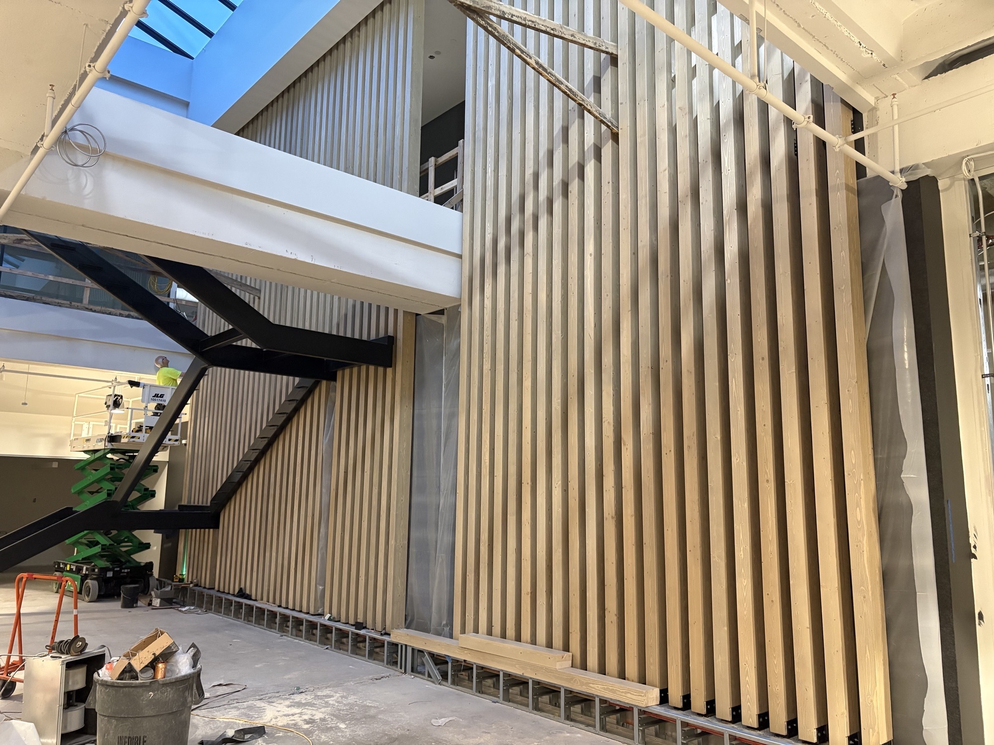 Beyond the technical advantages, the end result speaks to something more experiential. These vertical slats create a sense of movement and continuity, guiding visitors through the space while softening the scale of the lobby. This project is a reminder that impactful design doesn’t always rely on complexity. Sometimes, it’s about taking a simple material, elevating it through thoughtful design, and executing it with precision.